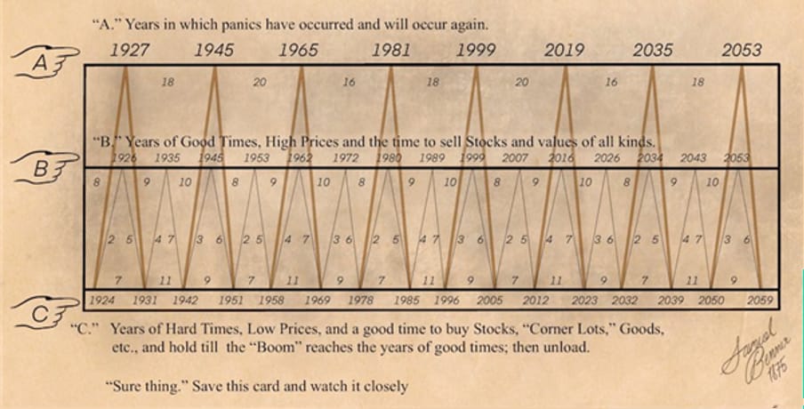 What I call the old pattern is a cycle idea that was made by a market watcher in the late eighteen hundreds called Samuel Benner. He believed prices and events repeat in time and that you could draw a repeating curve that lines up with many big booms and big drops over many years like 1929, 1989, 1999, 2008 and 2020. People have compared that old curve to real history and found it lines up with many big market tops and bottoms through the last one hundred and fifty years.